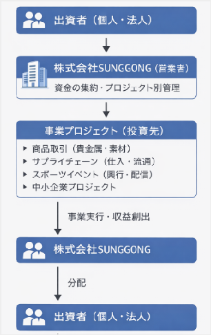 事業成長支援私募債は、実体経済における多様な事業プロジェクトへの投資機会を提供する共同投資型の商品です。本商品は、複数の個人および法人の投資資金を集約し、商品取引やサプライチェーンに関わる資金需要、スポーツイベントの企画・運営、ならびに中小企業の成長を支える事業案件に対して投資を行い、その成果に応じて分配を行う仕組みとなっています。